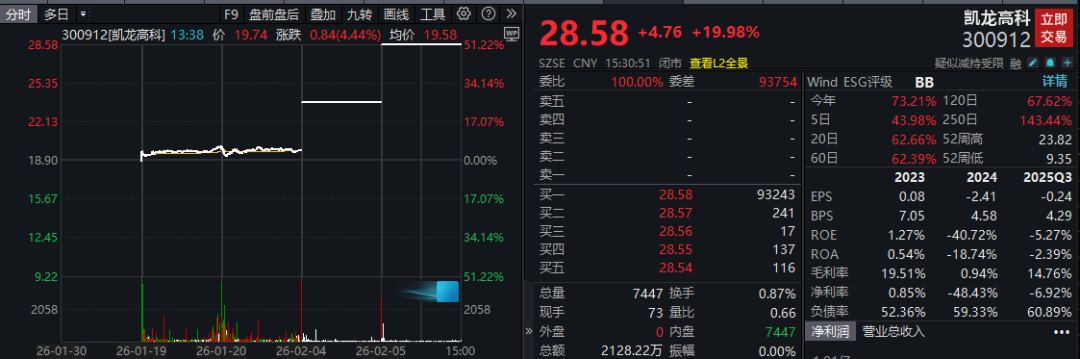 刚披露重大资产重组预案不久的尾气处理龙头凯龙高科(300912),自2月4日复牌以来已收获2个“20CM”涨停。截至今日收盘,该股买一位置仍有超过9万手等待成交,盘中最高封单额为9.52亿元。