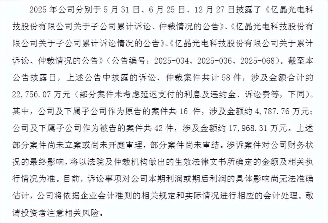 (图源:亿晶光电公告)涉及诉讼案件额超2亿,被追讨1.4亿元出资款