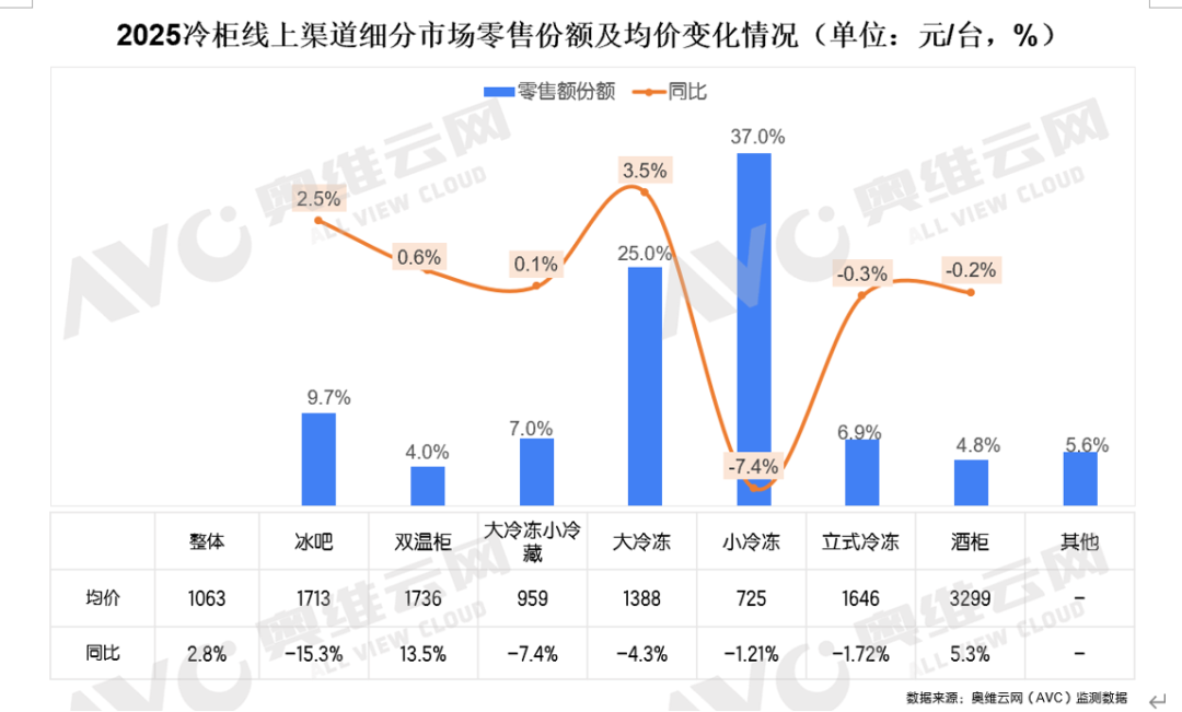 线上渠道作为冷柜市场的重要增长极,2025年整体均价达1063元,同比微增2.8%,需求结构的马太效应愈发明显。其中,冷冻品类已成为绝对的市场主力,“大冷冻”与“小冷冻”两大品类的零售份额合计突破62%,牢牢占据线上市场的主导地位,成为拉动线上增长的核心引擎。与此同时,双温柜、酒柜等细分品类的均价同比分别大涨13.5%和5.3%,可见,当前冷柜在线上市场的结构性升级的趋势已清晰可见。