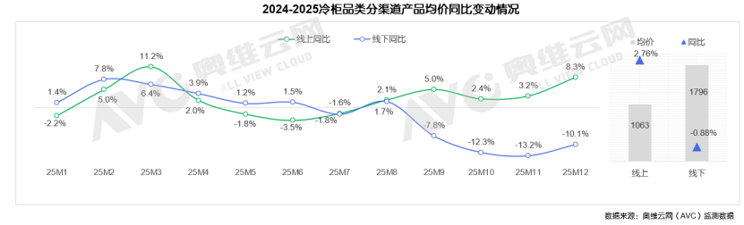 从冷柜产业的价格水平来看,2025年冷柜市场均价走势呈现显著的渠道分化特征,线上渠道均价水平波动上升,线下渠道均价水平波动下滑。据奥维云网监测数据,线上渠道冷柜均价呈波动增长态势,全年均价达到1063元,同比提升2.76%;线下渠道均价则呈波动下行走势,全年均价为1796元,同比微降0.88%。