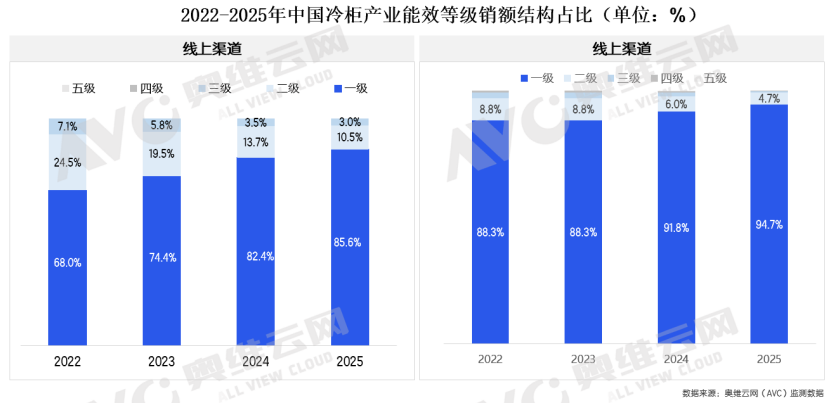 据奥维云网统计数据显示,2022-2025 年中国冷柜市场一级能效产品占比呈持续攀升态势。到 2025 年,线上渠道的一级能效冷柜占比已高达 85.6%;线下渠道的这一占比更是达到 94.7%,足见节能化已成为行业不可逆的发展大势。
