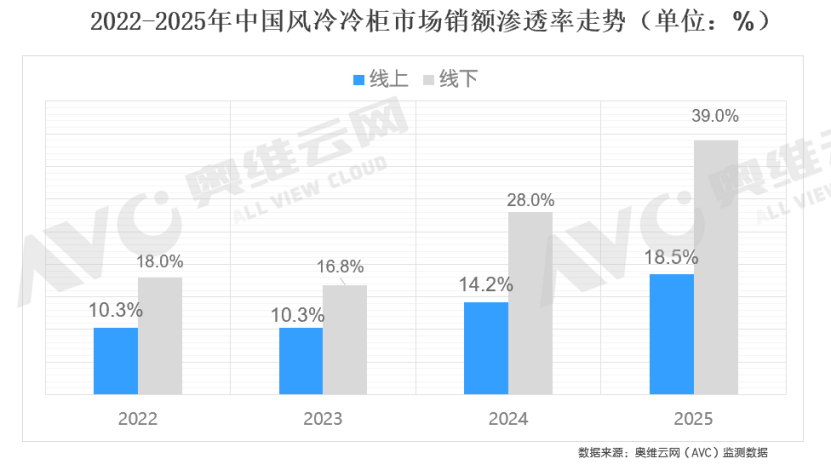 在消费升级与健康饮食理念深入人心的当下,冷柜产品的健康化已成为行业升级的核心方向之一,而风冷技术的迭代升级正是健康储鲜需求的关键支撑,让冷柜产品完成了从基础无霜到精准控风防风干的体验升维。据奥维云网统计数据显示,2022-2025 年风冷冷柜产品的渗透率呈稳步上升态势。截至 2025 年,风冷产品在线上渠道的渗透率已达 18.5%;线下渠道渗透率更是高达 39%,凸显出消费者对风冷技术的认可度持续提升。