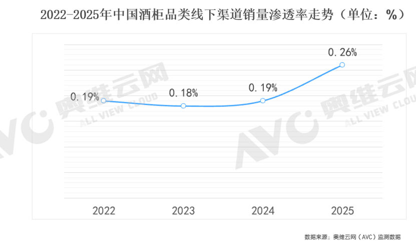 除冰吧持续收获消费者青睐外,酒柜的市场热度也同步上扬,成为高端冷柜赛道的又一增长亮点。在消费升级浪潮与品质生活理念的双重驱动下,这类高端冷柜细分品类的市场接受度正稳步提升。酒柜凭借精准的恒温恒湿控制能力,成为红酒等高端藏品的专属存储方案,精准契合了消费群体对品质生活的追求。从市场渠道表现来看,酒柜在线下渠道的销量渗透率呈波动增长态势。据奥维云网监测数据显示,2022-2025 年,酒柜在线下渠道的销量渗透率已从 0.19% 稳步提升至 0.26%,这一数据变化,直观印证了高端消费群体对专业储酒设备的需求正持续释放。
