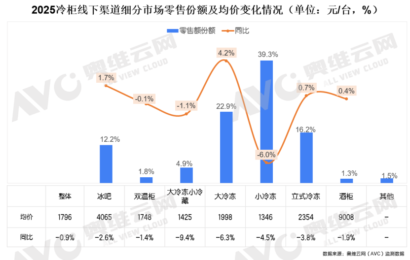 在线下渠道,其1796元的整体均价虽仍显著高于线上,但同比下滑0.9%,传统渠道的价格压力。与线上相似,冷冻品类同样主导着线下市场,大冷冻柜与大冷冻小冷藏的零售份额合计超62%。其中,大冷冻品类继续延续了增长势头,同比增幅达4.2%,进一步巩固了其功能型刚需的地位;而小冷冻品类尽管以39.3%的份额遥遥领先其他品类,但同比大幅下降暴露出其增长动能的不足。
