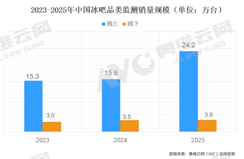 其中,高净值人群规模的持续扩容与生活方式的迭代升级,成为核心驱动力。一二线城市的高收入家庭、酒类收藏爱好者以及高端餐饮机构,对专业级储鲜的需求日益激增:冰吧凭借兼具储鲜与展示的双重属性,成为客厅社交场景的新核心。根据奥维云网统计数据显示,2023-2025年,中国冰吧销量连续三年,销量持续增长,至2025年,中国冰吧线上渠道监测销量达24.2万台,线下监测销量达3.6万台。