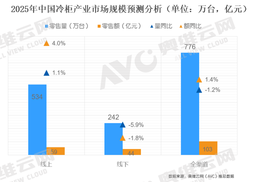 2025 年中国冷柜产业出现阶段性小幅回调。2026 年,冷柜零售量预计将延续下行趋势,全年规模约776万台,同比下降1.2%;但受益于风冷、深冷技术带来的产品结构升级,市场价值端表现更具韧性,零售额预计同比增长1.4%,突破103亿元,行业正从 “规模扩张”向“价值提升”转型。