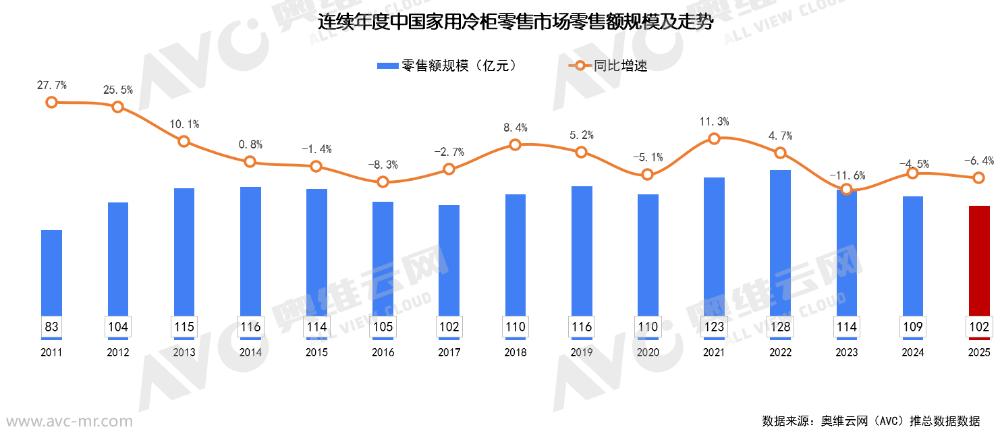 2022年至今,冷柜市场经历了突发脉冲后的“秩序重构与场景深化期”。2022年部分地区疫情封控催生了家庭食品“囤货”和“备灾”需求,冷柜作为“家庭冷链扩容”核心产品出现爆发式非理性增长,大量入门级产品被抢购。进入2023年后,囤货需求快速退潮,市场销量同比大幅回落,行业发展逻辑重新回归产品结构升级与场景深耕。家用场景向嵌入式冷柜、客厅立式冷冻柜、专储冷柜等方向深化,更贴合现代家居与生活方式;商用场景则伴随新茶饮店、预制菜门店等业态增长持续延伸,为商用冷柜带来稳定需求。市场竞争焦点也从规模价格战,转向对细分人群、细分场景的技术创新、产品设计与营销能力的比拼。2025年冷柜市场整体零售额达102亿元,较上年同比下降6.4%。