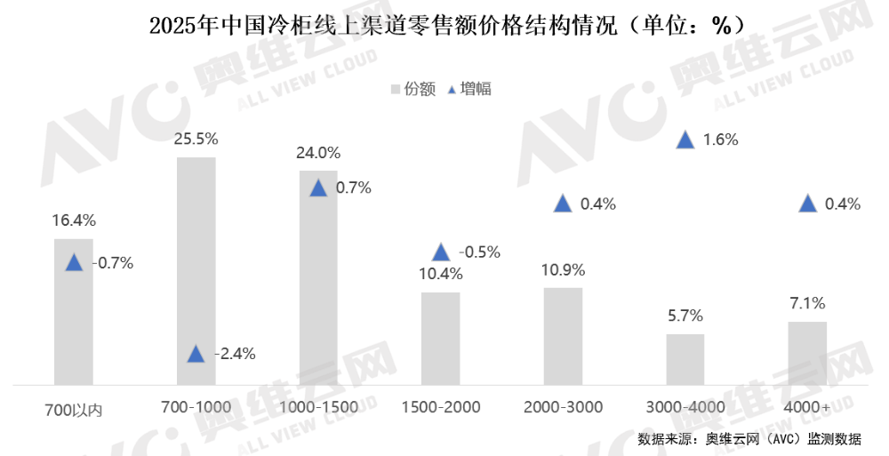 价格结构方面,线上、线下市场表现出差异化格局。线上渠道的价格带高度集中于700-1500元区间,该价格段零售额占比约50%,构成线上市场的核心基本盘。与此同时,线上渠道结构升级趋势凸显,2000元以上中高端价格段零售额占比合计达到23.7%,较上年提升2.4个百分点,高端化消费需求持续释放。