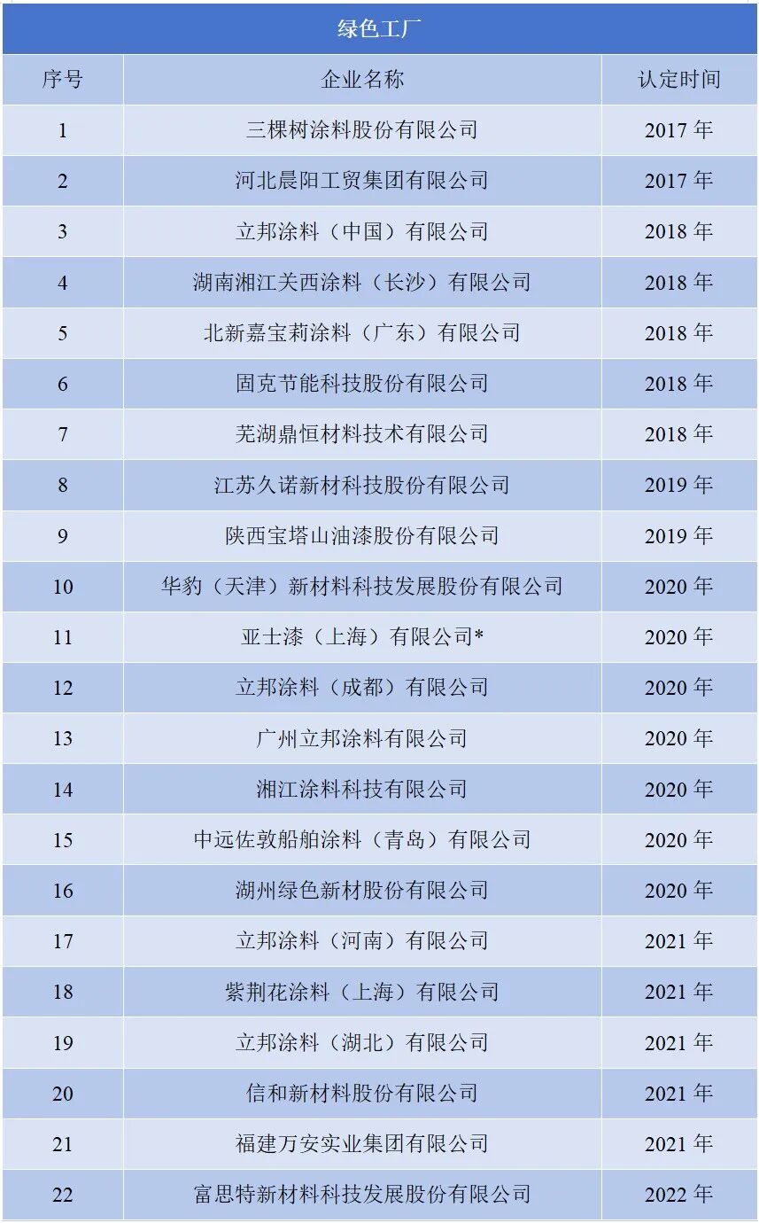 涂界记者注意到,河北硅谷化工有限公司、河北三棵树涂料有限公司、佐敦涂料(张家港)有限公司、阿克苏诺贝尔功能涂料(常州)有限公司、江苏冠军科技集团股份有限公司、海虹老人涂料(张家港)有限公司、江苏云湖新材料科技有限公司、浙江兄弟路标涂料有限公司、福建省三棵树新材料有限公司、洁士美建材科技有限公司、濮阳展辰新材料有限公司、武汉双虎涂料股份有限公司、湖北三棵树新材料科技有限公司、长沙飞鹿高分子新材料有限责任公司、广东邦固化学科技有限公司15家涂料企业被认定为国家级“绿色工厂”,被认定为数量创下历史新高。值得一提的是,曾于2020年被认定为国家级“绿色工厂”的亚士漆(上海)有限公司被移出。