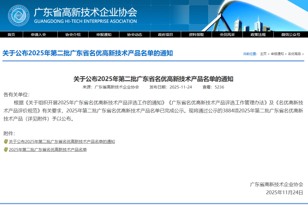 “广东省名优高新技术产品”是广东省科学技术厅、广东省高新技术企业协会为促进科技创新与技术攻关,推动关键核心技术创新能力提升,引导企业以高质量科技供给助推高质量发展而设立的省级产品荣誉。评选着重考察产品的技术领先性与市场竞争力,获评产品通常具备国内首创、可替代进口、达到国内国际先进水平等特点,是企业核心实力的重要体现。