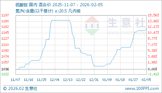 据生意社监测,硫酸铵02月05日最新价格1160.00元/吨,最近30天上涨10.83%。