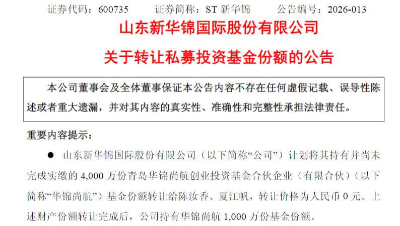 经济导报记者 于婉凝2月4日,ST新华锦(维权)(600735.SH)发布公告称,计划将持有并尚未完成实缴的4000万份青岛华锦尚航创业投资基金合伙企业(有限合伙)(下称“华锦尚航”)的基金份额转让给陈汝香、夏江帆,转让价格为0元。