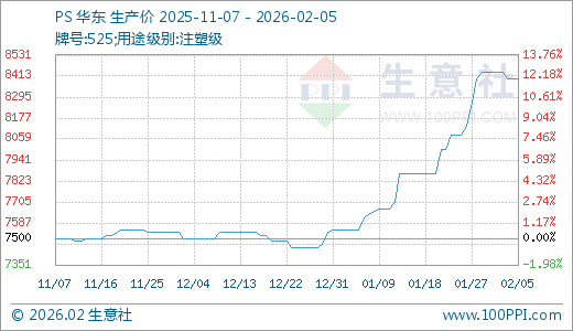 据生意社监测,PS02月05日最新价格8400.00元/吨,最近30天上涨10.28%,60天上涨12.00%。