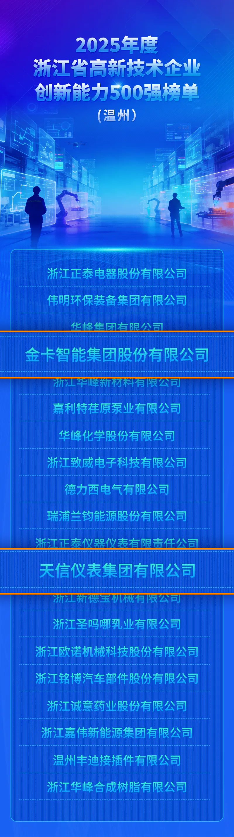 近日,2025年度浙江省高新技术企业创新能力500强榜单发布,金卡智能集团及天信仪表集团双双登榜。该榜单由省科技信息研究院、省工业和信息化研究院联合评选,聚焦 “研发投入、人才队伍、知识产权、成果转化” 等核心维度。此次入选,标志着企业的创新能力和行业领先地位再获省级权威认证。