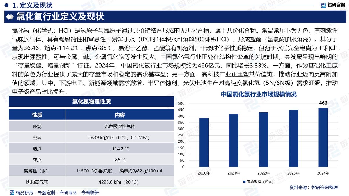氯化氢(化学式:HCl)是氢原子与氯原子通过共价键结合形成的无机化合物,属于共价化合物。常温常压下为无色、有刺激性气味的气体,具有强腐蚀性和窒息性,易溶于水(0℃时1体积水可溶解500体积HCl),形成盐酸(氢氯酸的水溶液)。中国氯化氢行业正经历结构性变革,呈现“存量稳健、增量创新”特征。2024年,中国氯化氢行业市场规模约466亿元,同比增长3.33%,基础化工需求构成稳定基本盘,而电子、新能源领域需求激增推动高纯度(5N/6N级)产品占比提升,支撑半导体、光伏产业链自主可控。