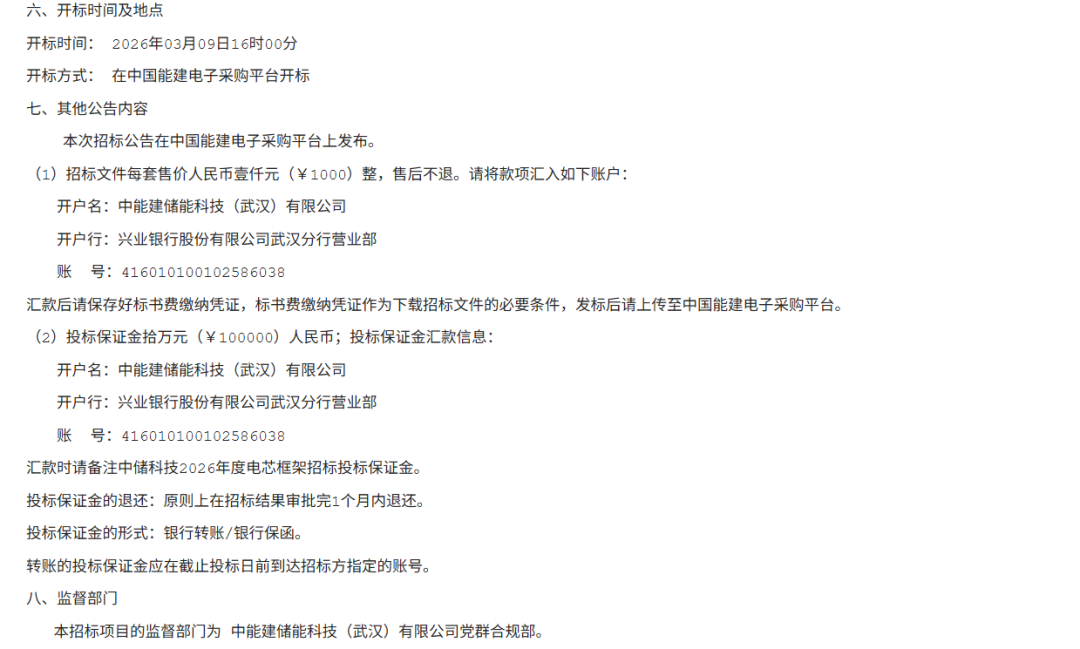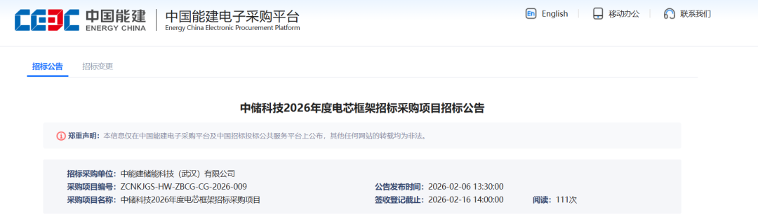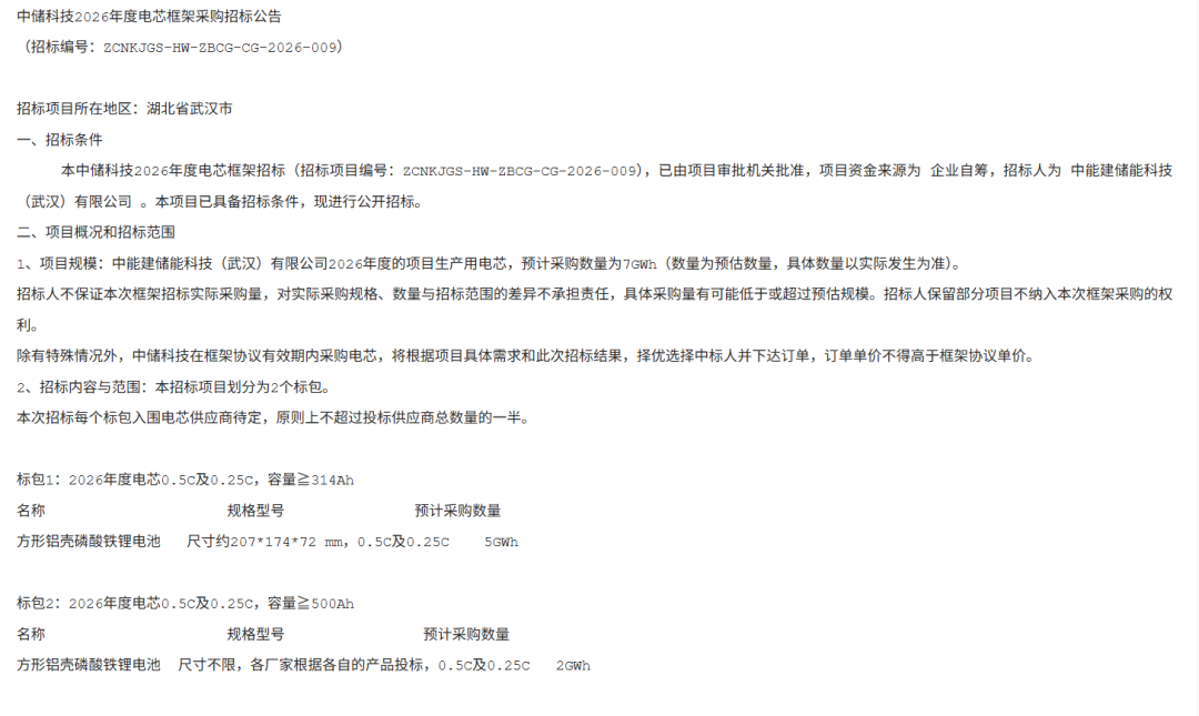 2月6日,中国能建旗下中储科技发布2026年度电芯框架招标公告。预计采购容量为7GWh,分为两个标包。