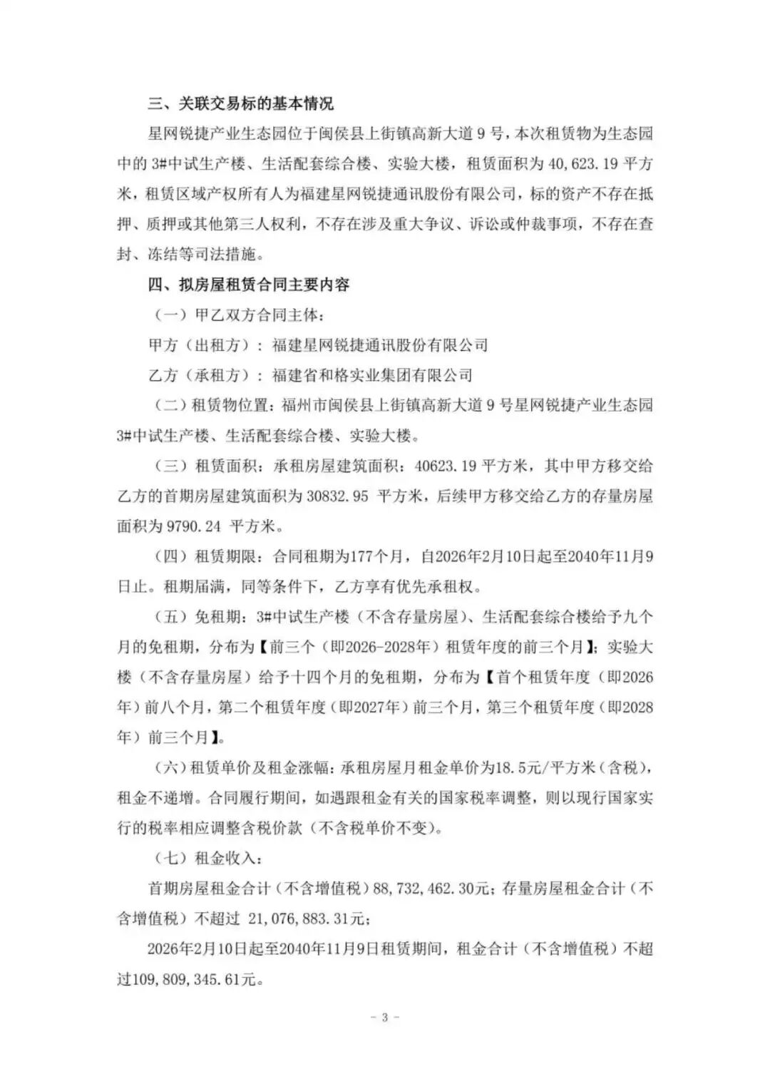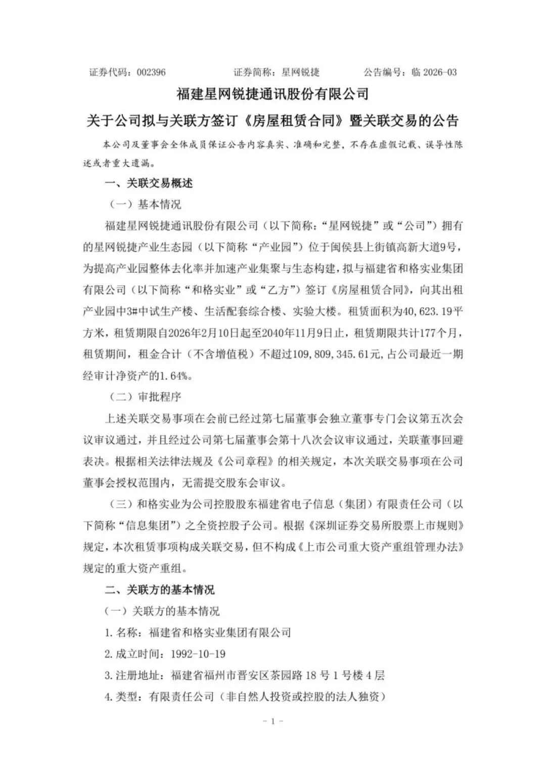 2月3日,星网锐捷公布公告称,为提高产业园整体去化率并加速产业集聚与生态构建,拟与福建省和格实业集团签订《房屋租赁合同》,向其出租位于闽侯上街星网锐捷产业生态园中3#中试生产楼、生活配套综合楼、实验大楼。