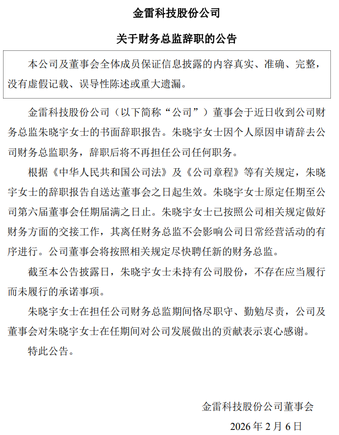 北极星风力发电网获悉,2026年2月6日,金雷科技股份公司发布公告称,公司财务总监朱晓宇因个人原因辞去职务,且不再担任公司任何职务。值得注意的是,朱晓宇于2025年10月28日才正式任职财务总监,至今任职时间不足四个月,引发市场关注。