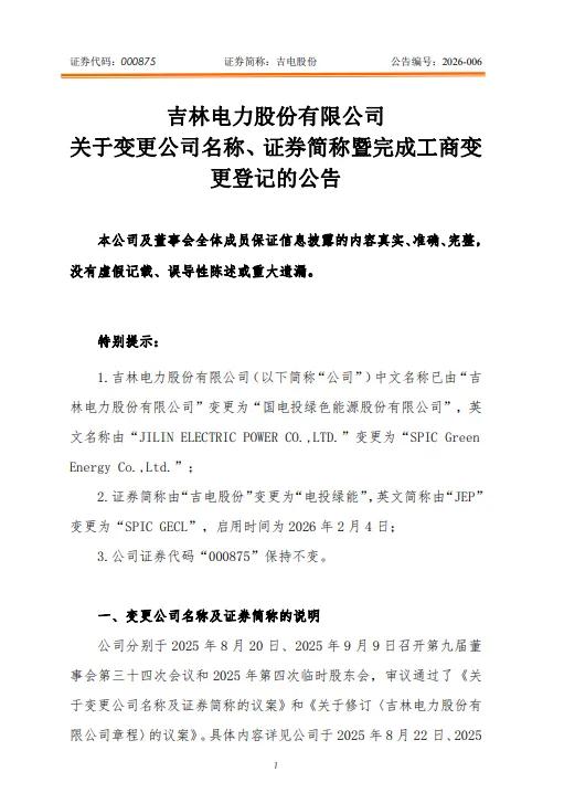 2.证券简称由“吉电股份”变更为“电投绿能”,英文简称由“JEP”变更为“SPIC GECL”,启用时间为 2026 年2 月4 日;