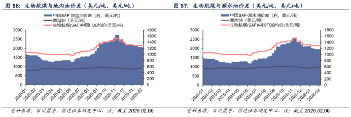 生物航煤价格及价差:截至2026年2月6日,中国生物航煤港口FOB价格为2150美元/吨,较上周五价格持平,与地沟油、潲水油价差分别为1222.92、1172.15美元/吨,较上周五价差-14.30、-6.15美元/吨。欧洲生物航煤港口FOB价格为2200美元/吨,较上周五价格+65美元/吨。