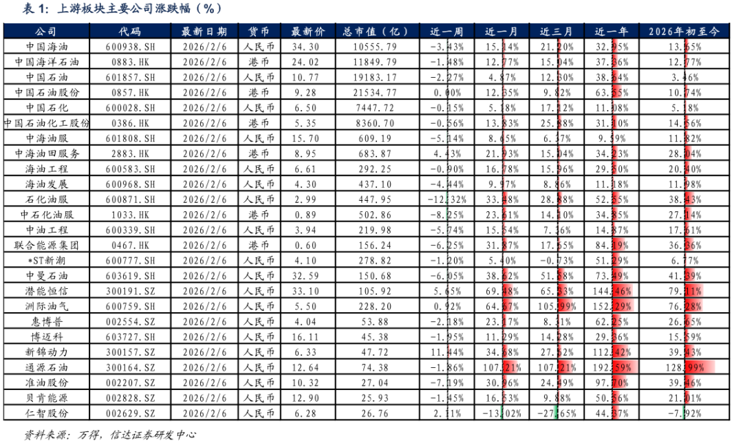截至2026年2月6日当周,上游板块股价表现较好的是新锦动力(+11.44%)、潜能恒信(+5.65%)、中海油田服务H(+4.43%)等。