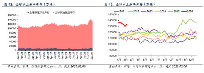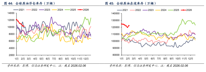 截至2026年2月6日当周,全球原油水上库存(包括在途和浮仓)为13.26亿桶,较上周+2270.6万桶(+1.71%)。其中,全球原油浮仓库存为10248.2万桶,较上周-129.4万桶(-1.26%);全球原油在途库存为12.24亿桶,较上周+2400万桶(+1.96%)。