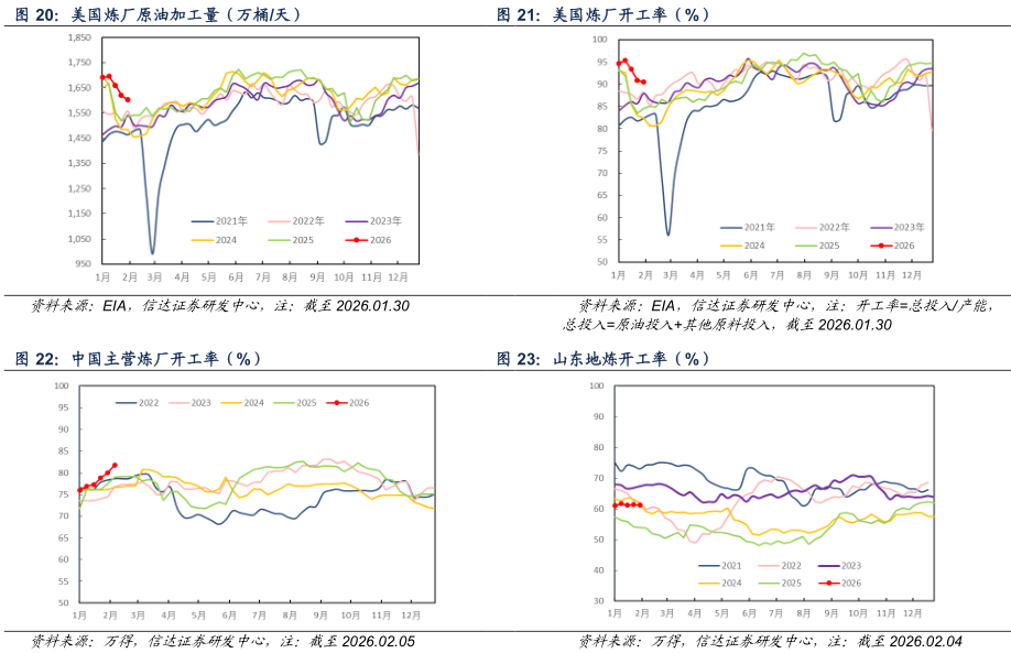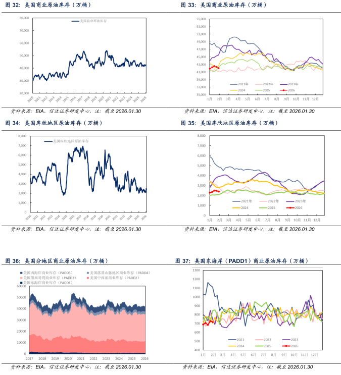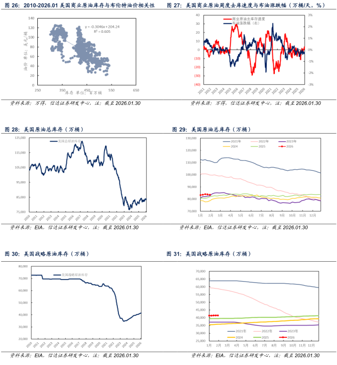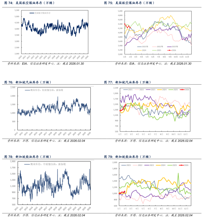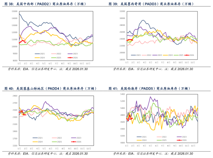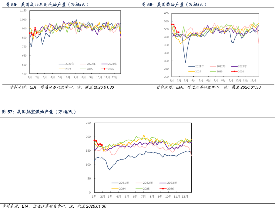 产量方面:截至2026年01月30日当周,美国成品车用汽油、柴油、航空煤油产量分别为900.9、481.4、170.5万桶/天,较上周分别-56.5(-5.90%)、-0.5(-0.10%)、-3.7(-2.12%)万桶/天。