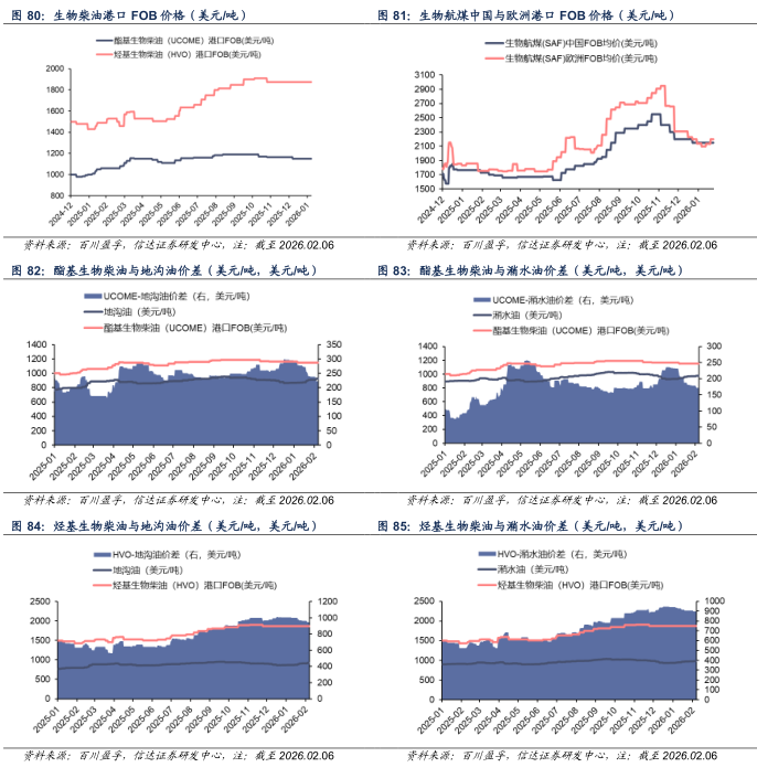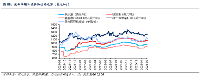 原料油价格:截至2026年2月6日,中国地沟油、潲水油价格分别为927.08、977.85美元/吨,较上周五价格+14.30、+6.15美元/吨,中国餐厨废油UCO价格为1080美元/吨,较上周五价格+5美元/吨。