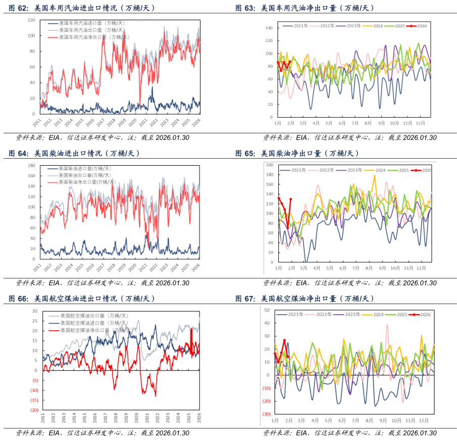 柴油板块:截至2026年01月30日当周,美国柴油进口量为19.7万桶/天,较上周减少5.6万桶/天(-22.13%);出口量为149.4万桶/天,较上周增加53.8万桶/天(+56.28%);净出口量为129.7万桶/天,较上周增加59.4万桶/天(+84.50%)。