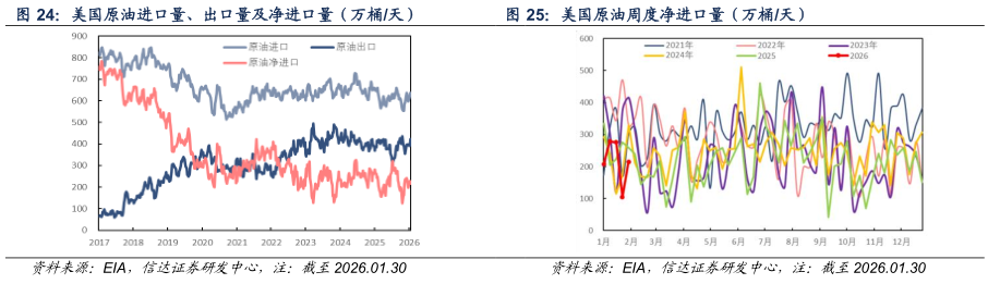 截至2026年01月30日当周,美国原油进口量为620.1万桶/天,较上周增加55.9万桶/天(+9.91%),美国原油出口量为404.7万桶/天,较上周减少54.2万桶/天(-11.81%),净进口量为215.4万桶/天,较上周增加110.1万桶/天(+104.56%)。