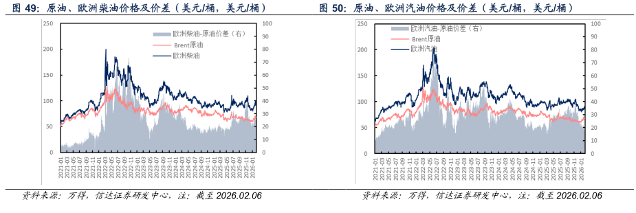 原油价差:截至2026年02月06日当周,布伦特-WTI期货价差为4.5美元/桶,较上周扩大0.39美元/桶;布伦特现货-期货价差为3.37美元/桶,较上周收窄0.34美元/桶;布伦特-俄罗斯Urals价差为2.56美元/桶,较上周收窄1.27美元/桶;WTI-俄罗斯Urals价差为-1.94美元/桶,较上周收窄1.66美元/桶;布伦特-俄罗斯ESPO价差为12.59美元/桶,较上周收窄5.69美元/桶;WTI-俄罗斯ESPO价差为8.09美元/桶,较上周收窄6.08美元/桶。