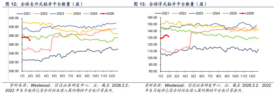 已有合同的钻井平台数量:截至2026年2月2日当周,全球海上自升式钻井平台数量为370座,较上周减少6座,其中东南亚、北美、其他地区分别减少1、4、1座;全球海上浮式钻井平台数量为132座,较上周减少2座,其中欧洲增加1座,北美、其他地区分别减少1、2座。