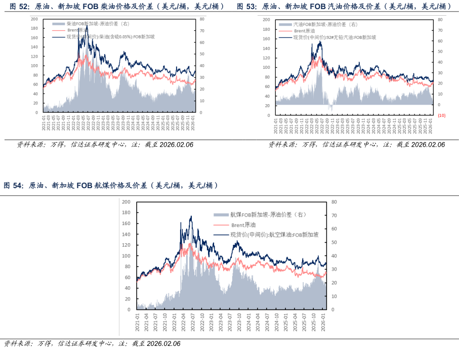 东南亚市场:截至2026年02月06日当周,新加坡柴油、汽油、航煤周均价分别为87.65(+1.12)、71.72(-0.40)、86.09(+0.27)美元/桶;与原油差价分别为20.52(+1.73)、4.70(+0.32)、18.98(+0.89)美元/桶。
