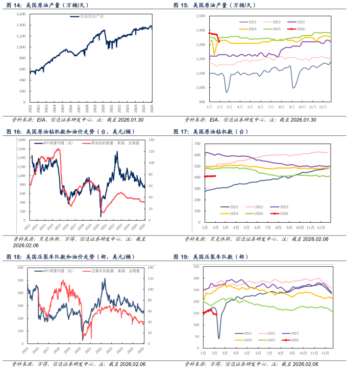 【美国原油供给】截至2026年01月30日当周,美国原油产量为1321.5万桶/天,较上周减少48.1万桶/天。截至2026年02月06日当周,美国活跃钻机数量为412台,较上周增加1台。截至2026年02月06日当周,美国压裂车队数量为145部,较上周减少3部。