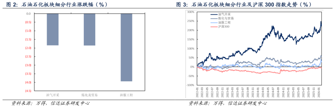 截至2026年2月6日当周,油气开采板块下跌1.84%,炼化及贸易板块下跌1.86%,油服工程板块下跌3.94%。