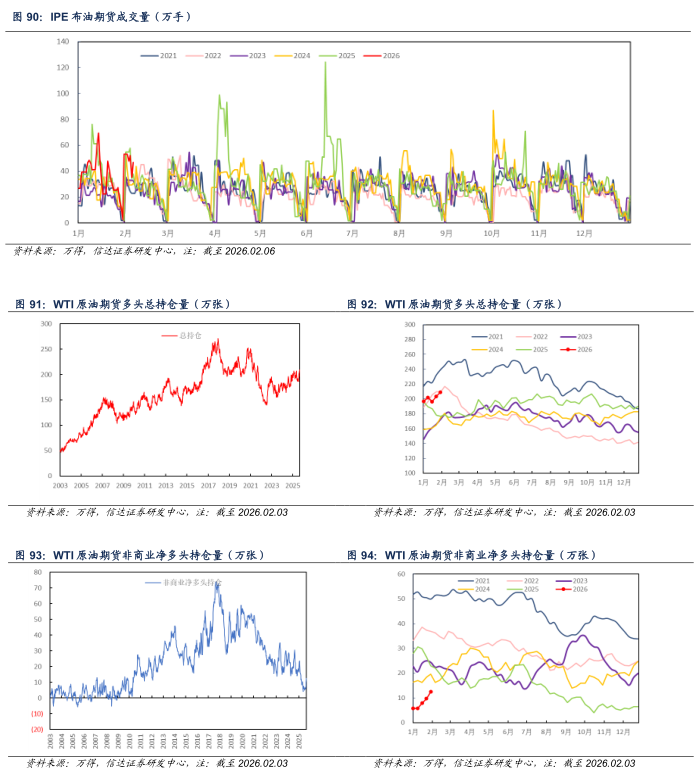 原油期货成交及持仓:截至2026年02月06日,周内布伦特原油期货成交量为341.19万手,较上周增加206.39万手(+153.10%)。截止至2026年02月03日,周内WTI原油期货多头总持仓量为209.13万张,较上周增加5.57万张(+2.73%);非商业(投机和套利目的持有)净多头持仓12.46万张,较上周增加2.76万张(+28.44%)。