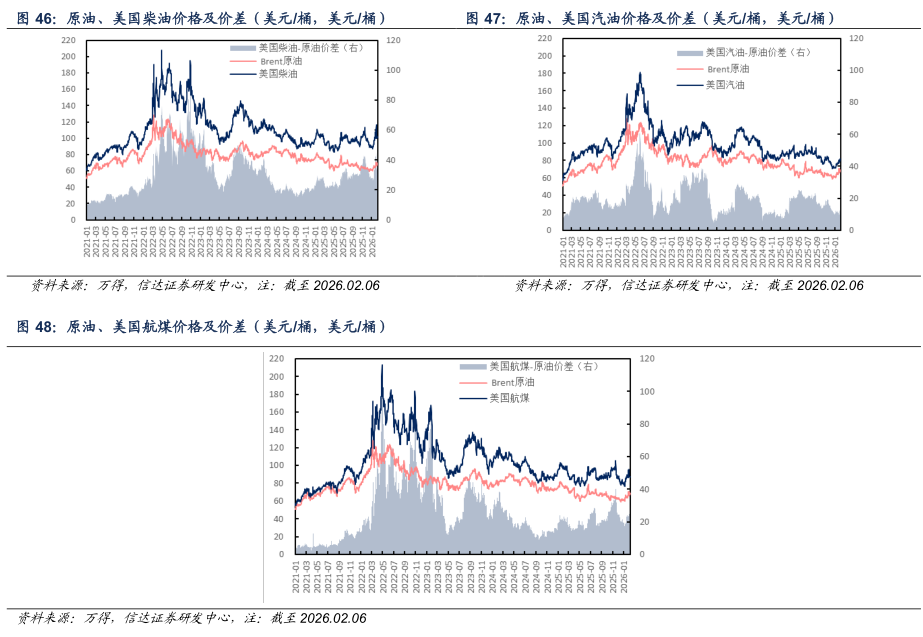 北美市场:截至2026年02月06日当周,美国柴油、汽油、航煤周均价分别为100.68(-9.48)、79.79(+1.31)、87.44(-2.85)美元/桶;与原油差价分别为33.35(-9.07)、12.46(+1.72)、20.12(-2.44)美元/桶。