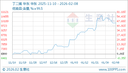 据生意社监测,丁二烯02月08日最新价格10033.33元/吨,最近30天上涨10.05%,60天上涨42.65%。