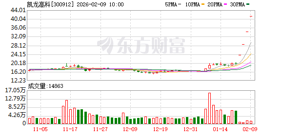 凯龙高科盘中涨停,已连收4个涨停板,截至9:25,该股报41.16元,换手率0.68%,成交量58.27万股,成交金额2398.39万元,涨停板封单金额为10.70亿元。连续涨停期间,该股累计上涨107.36%,累计换手率为4.89%。最新A股总市值达47.29亿元,A股流通市值35.37亿元。