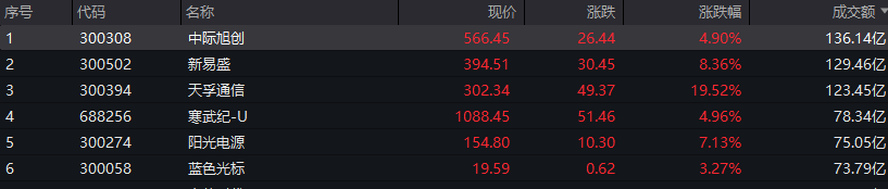 光模块(CPO)指数大涨8.75%,光模块龙头股中际旭创、新易盛、天孚通信盘中集体爆发,不足半日成交额均破百亿元,占据A股前三位置。天孚通信逼近20cm涨停,刷新历史新高。中际旭创盘中涨超5%,新易盛涨超9%。此外,光库科技一度涨停,太辰光涨逾15%,罗博特科、长芯博创等盘中涨逾10%。