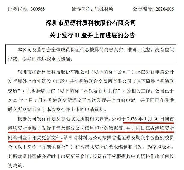 近日,深圳市星源材质科技股份有限公司(简称:星源材质)第2次向港交所递交招股书,拟在香港主板上市,独家保荐人为中信建投国际。公司于2016年12月在A股上市,股票代码300568,截至2026年2月2日的A股市值达178亿人民币。
