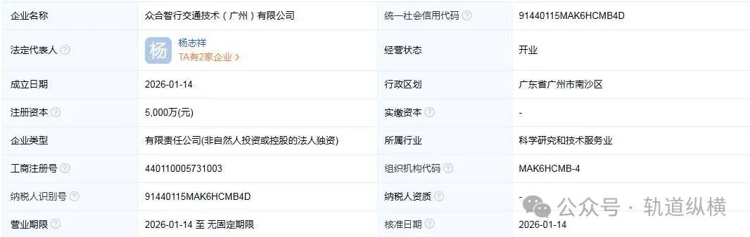 近日,众合智行交通技术(广州)有限公司成立,法定代表人为杨志祥,注册资本为5000万元,经营范围包含:航空商务服务;航空运营支持服务;智能无人飞行器制造;城市轨道交通设备制造等。企查查股权穿透显示,该公司由众合科技旗下众合智行轨道交通技术有限公司全资持股。