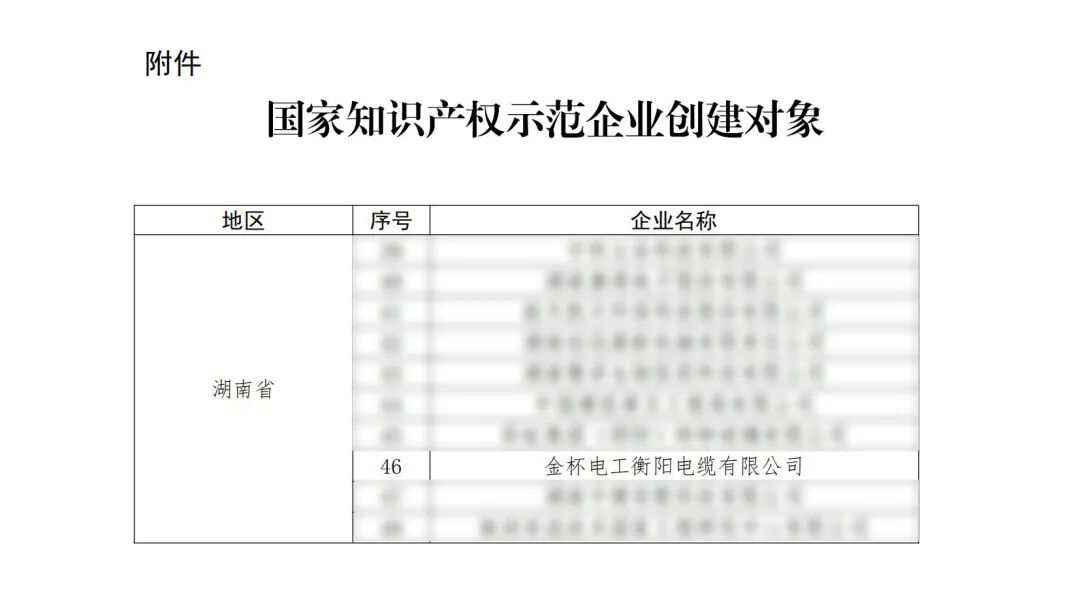近日,国家知识产权局正式公布“2025-2027年国家知识产权示范企业创建对象名单”,金杯电缆凭借贯穿创造、运用、保护与管理全链条的卓越知识产权体系成功入选,在本年度湖南省线缆行业中独占鳌头,拿下了这一重量级认定。