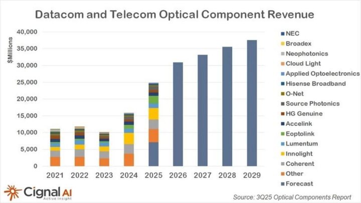 市场研究机构Cignal AI报告显示,2025年光器件市场营收将创历史新高,数通板块的营收预计超过180亿美元,相干光模块营收则达到近60亿美元。从2024年到2029年,数通光模块市场营收预计将以超过20%的复合年增长率持续增长,到预测期末将达到近290亿美元。