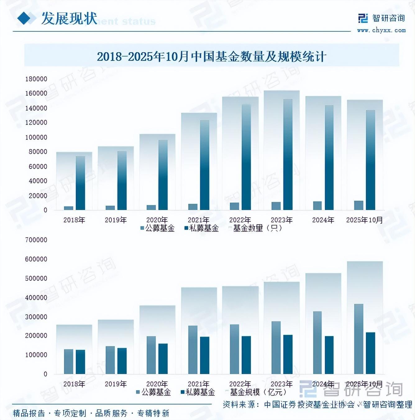 随着房地产行业步入平稳发展新常态,叠加储蓄利率市场化持续下行的趋势,大众投资理财需求正从单一的保值诉求,向多元的增值目标进阶,在此背景下,国民资产配置结构发生显著调整,资金正从传统的储蓄、房地产领域,加速向标准化的权益类、固收类基金产品迁移,基金作为专业的资产管理载体,在承接居民财富迁移浪潮中具备广阔的发展空间,据中国证券投资基金业协会数据显示,截止2025年10月我国基金数量151286只,其中,公募基金13381只,私募基金137905只;基金规模590112.3亿元,其中,公募基金3269598.5亿元,私募基金220513.8亿元,目前,我国多层次的基金产品体系已初步形成,能够有效适配居民多元化的财富管理需求。