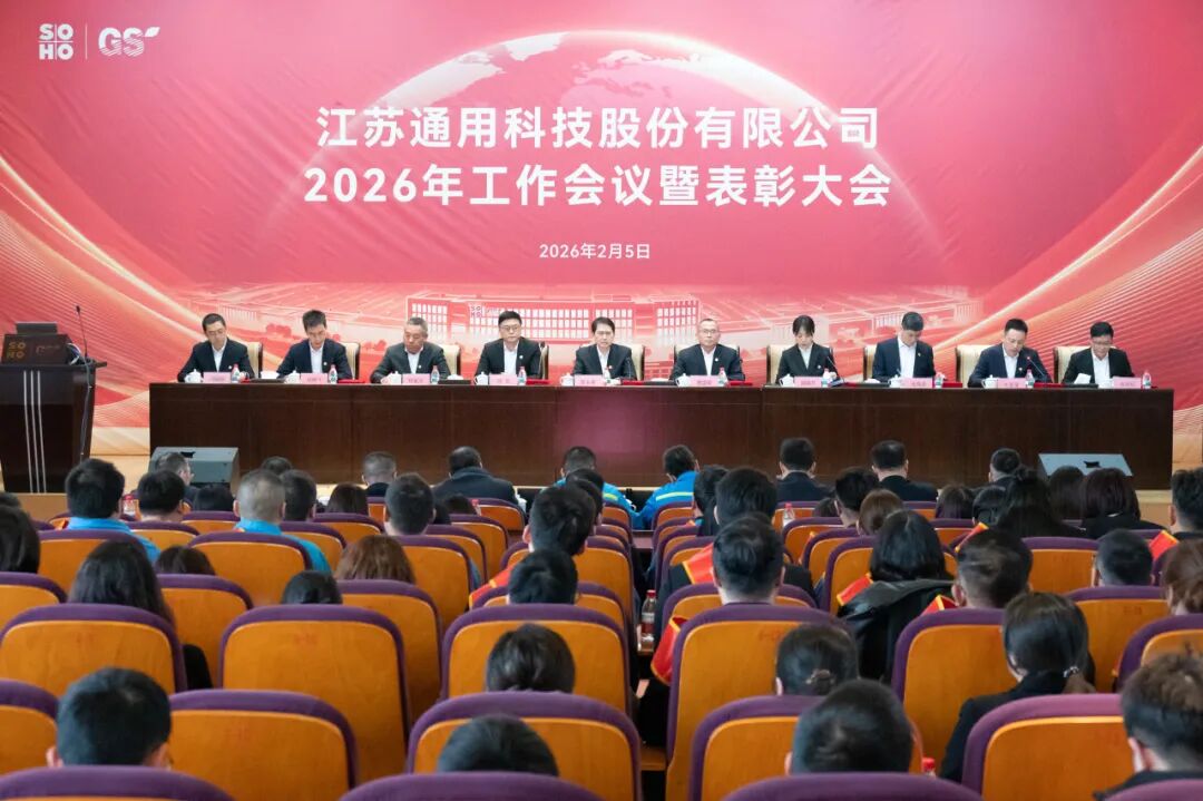 2月5日,通用股份召开2026年工作会议暨表彰大会,全面总结2025年工作,分析形势、部署2026年重点任务。苏豪控股集团党委委员、副总裁晋永甫出席讲话,公司党委书记、董事长贾国荣,党委副书记、总经理顾萃及领导班子、全体员工现场参会,泰国、柬埔寨海外基地线上参会。