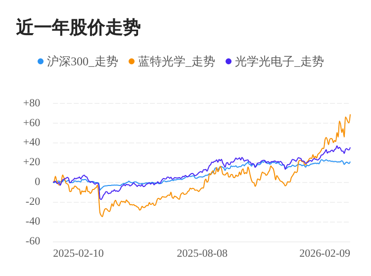 02月09日,蓝特光学股价大涨。截至今日收盘,蓝特光学上涨5.43%,收盘价为50.31元,收盘价创历史新高。