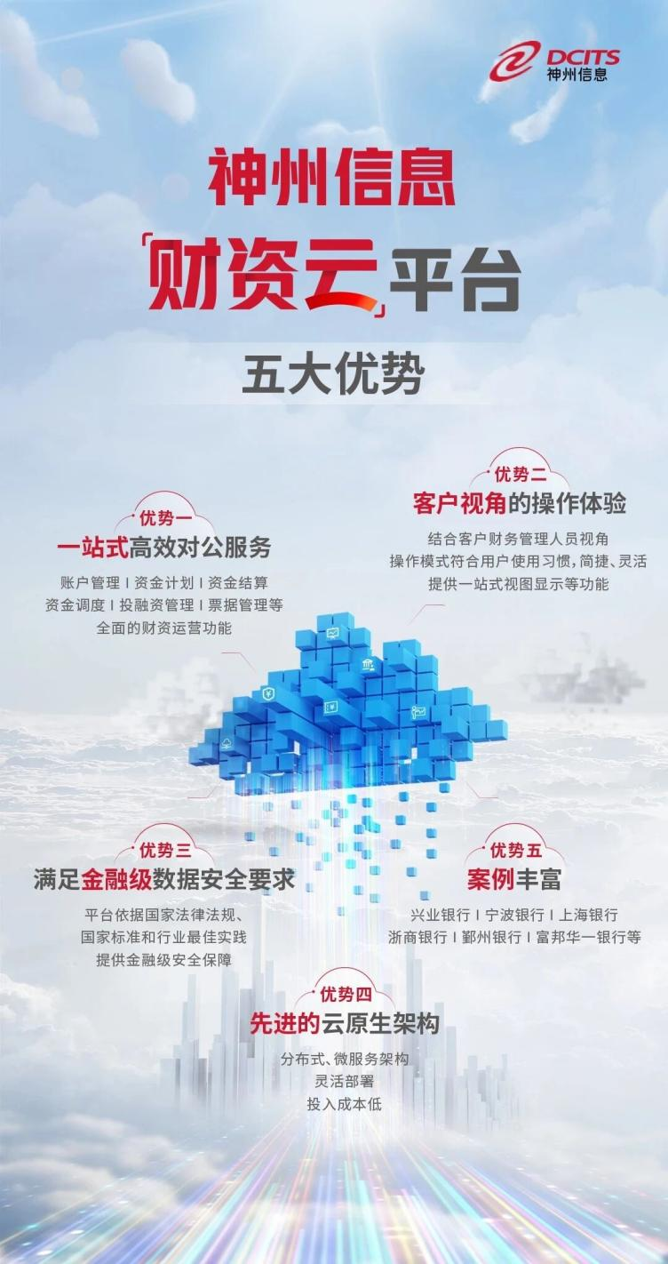 神州信息“财资云”平台可以为银行提供从基础的企业与用户管理、多银行账户统一视图、跨行资金归集与调拨,到复杂的资金预算控制、投融资管理、供应链金融、票据全生命周期管理、风险监控预警、管理驾驶舱以及监管报送等核心功能,能够满足大、中、小型各类集团企业的财资管理需求。