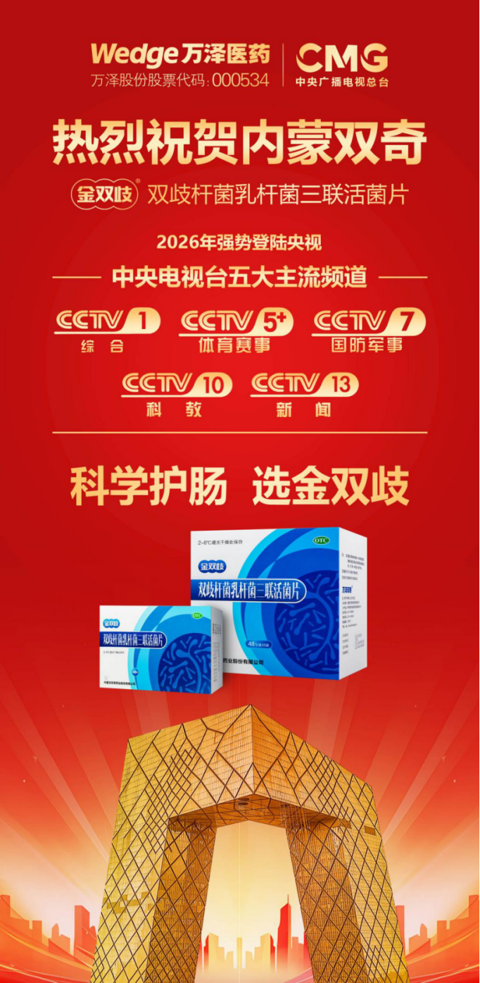 骐骥迎春至,万象启新程!自2026年2月9日起,万泽医药即将正式登陆央视,旗下金双歧®重磅亮相,强势覆盖CCTV-1、5、7、10、13等多个权威频道,引领微生态疗法新时代!30年精研原籍益生菌,药品标准,可做酸奶,全家适用——科学护肠,选金双歧!