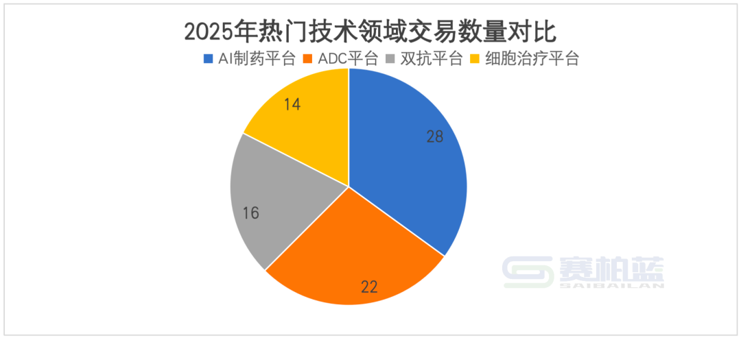 2025年BD交易中最引人注目的现象是技术平台类交易的数量和金额双双创下新高。其中,AI制药和ADC两大领域表现尤为突出。